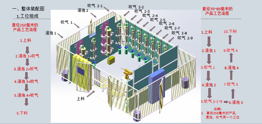 1.機器人從浸液3吹掃工位搬運(yùn)膜組旋轉(zhuǎn)180°到浸液4浸液工位(wèi),氣缸夾緊膜(mó)組,馬達驅動(dòng)卡(kǎ)緊上下端蓋。